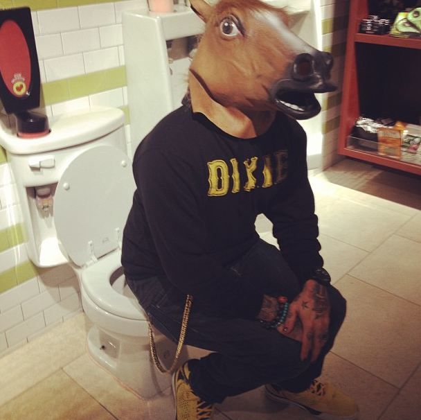 Esta mañana nuestro AJ publicaba un par de fotos en su cuenta de Instagram, una era de el sentado en el lavabo o mejor dicho haciendo ver que estaba sentado y con una mascara con la cara de un caballo, en el mensaje incluso decía "Caca de caballo", mas tarde subía una foto de un plato de comida, creemos que ya la cena por la alta diferencia horaria que hay en China, a continuación ambas fotos y los mensajes, todo en el orden de aparición