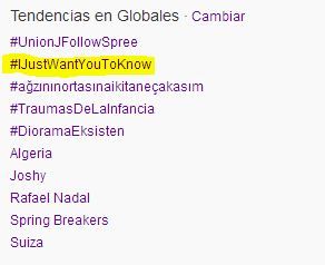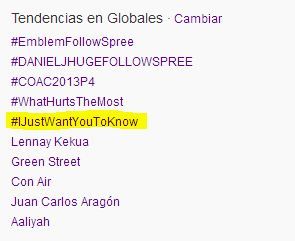 Tal y como os hemos explicado mas o menos AQUI BSB esta noche pasada twitteaba con el hastag IJustWantYouToKnow y nos pedían que los twittearamos y les dijéramos lo que siempre hemos querido decirles. Este Hastag enseguida entro en la lista de Trending Topic Mundiales colocándose en el quinto puesto, y se a mantenido como hastag mundial nada mas y nada menos que 21 horas!! En uno de los momentos incluso a estado en el segundo puesto! A continuación ambas imágenes