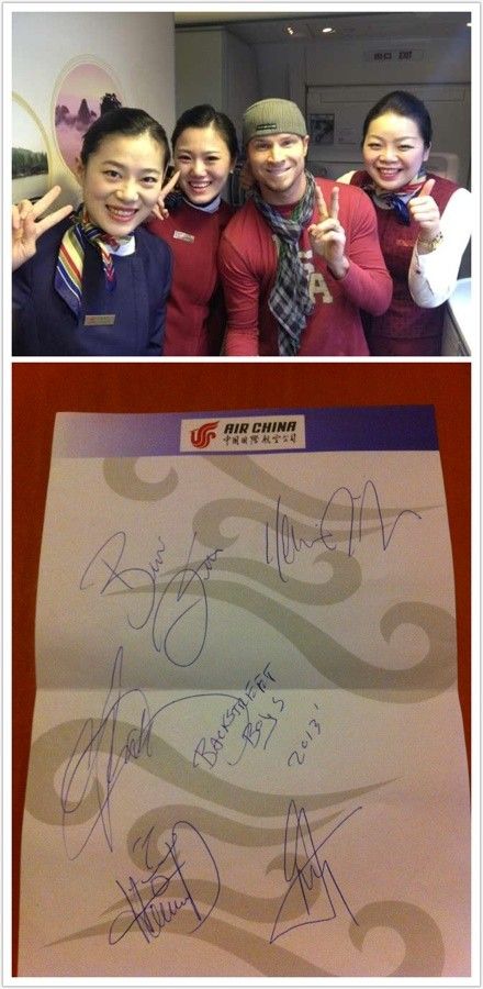 Esta noche pasada después de la vuelta a casa de nuestros chicos aparecía una foto donde en ella vemos a Brian con las azafatas del avión y a demás una foto enganchada donde también vemos las firmas de todos los BSB, a continuación la foto