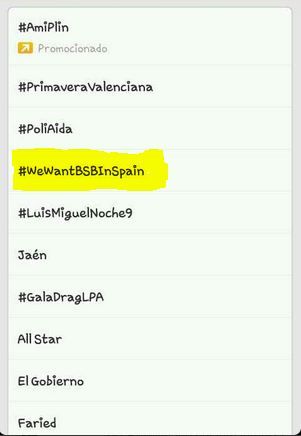 Ayer AQUI os informábamos de como había ido la campaña para traer a BSB a España, fue un total exito, en la noticia os informábamos que el hastag wewantbsbinspain había estado en diferentes puestos de Trending Topics de España durante las 11 horas que estuvo, gracias a una fan de Mallorca, tenemos la imagen de cuando el hastag estuvo en el cuarto puesto! A continuación la captura
