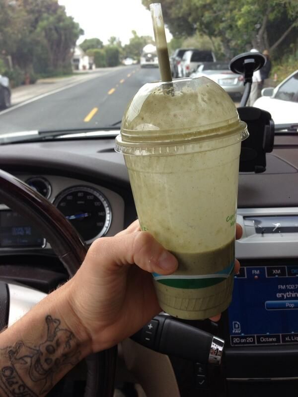 - Comenzando el dia con un plátano magro, macha, verdes de California, mantequilla de almendras y leche, aceite de coco, hielo, datiles