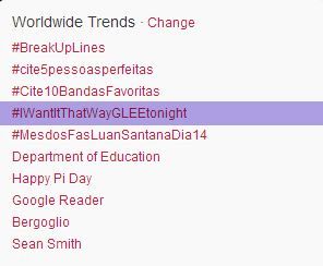Esta noche pasada nuestros BSB en motivo del capitulo de Glee con la canción IWITW en el pedían a todas las fans que twittearan con el hastag #IWantItThatWayGleeTonight y con este hastag consiguieron hacer TT Mundial en muy poco tiempo, con este hastag se colocaron enseguida en el cuarto puesto de Temas de los cuales se hablaba mas en ese momento en twitter de todo el mundo!! A continuación la captura de este momento