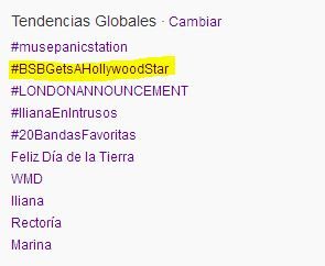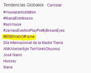 En motivo del día tan especial de hoy nuestros chicos han sido Trending Topic Mundial dos veces y con dos Hastags diferentes, el primero BSBWalkOfFame que le hemos visto en el quinto puesto de la lista, pero lo hemos conseguido las fans solas, sin que los propios BSB lo pidieran, el otro a sido BSBGetsAHollywoodStar y este se a encontrado en el segundo puesto de Trending Topics mundiales!! A continuación las dos capturas que hemos echo de estos momentos. Sabemos que uno de los dos TT a estado primero pero por la cantidad de fotos y momento emotivo nos a sido imposible capturarlo, si lo tenéis, y lo queréis compartir envíanoslo!!