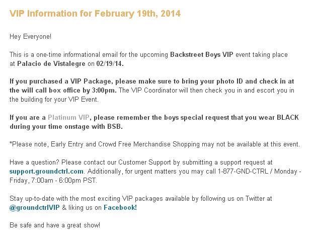 Se trata de un correo electrónico informativo de una sola vez para el próximo evento VIP de Backstreet Boys que tendrá lugar en Palacio de Vista Alegre el 19/02/14.